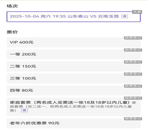 购票平台上,泰山VS云南玉昆所有球票都显示“缺货登记”状态。