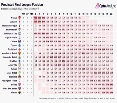 英超七轮过后,数据机构OPTA超级计算机预测本赛季英超冠军的