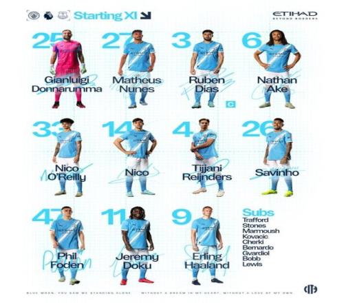 英超第8轮,曼城主场迎战埃弗顿,赛前曼城首发阵容已经出炉,具体名单如下: 曼城首发:唐纳鲁马 / 努内斯、鲁本·迪亚斯、阿克、奥赖利 / 尼科·冈萨雷斯、赖因德斯 / 萨维尼奥、福登、多库 / 哈兰德