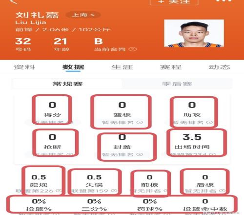 上一轮打同曦,这位替补中的替补,板凳中的板凳,上场2分钟左右,11项技术统计数据,同样全是0。当笔者打开刘礼嘉本赛季的数据库,呵呵,一色的“0”字头,直接亮瞎了老夫的双眼……