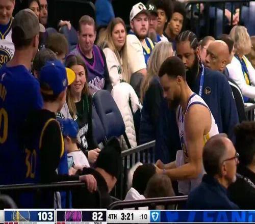 第四节,库里早早下场,已经在场边给小球迷签名了