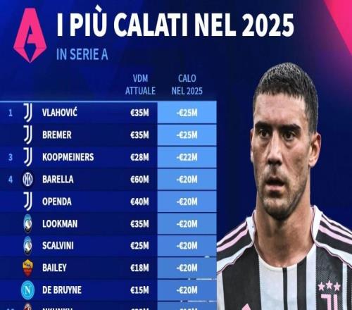 德转列意甲2025年身价跌幅榜:尤文包揽前三,DV9跌2500万最高 -